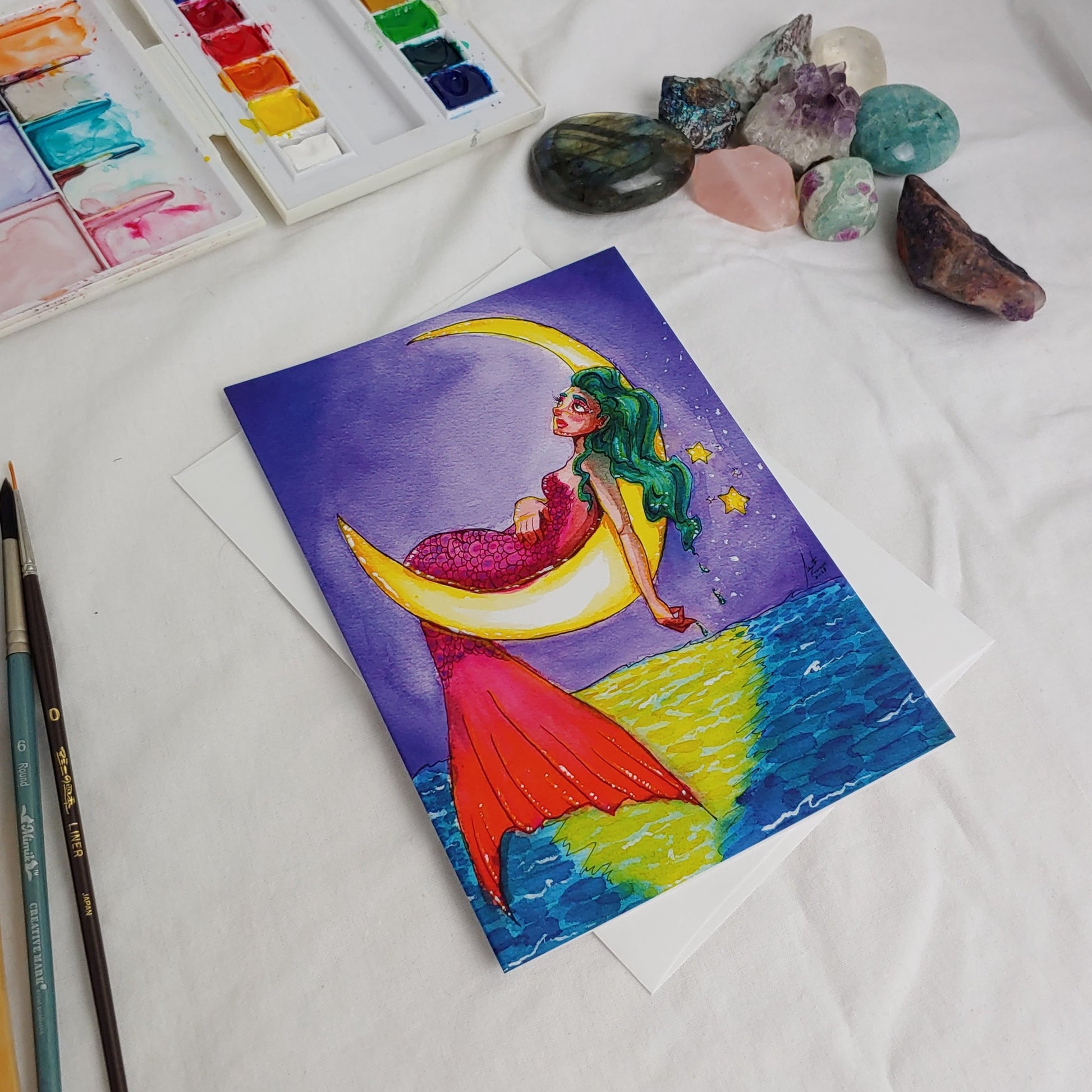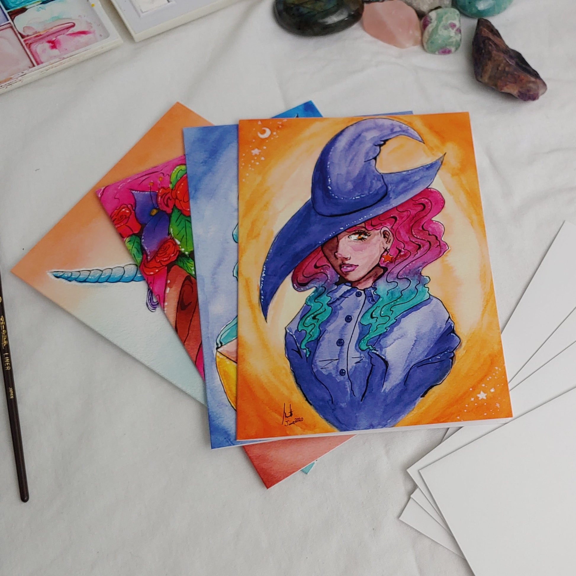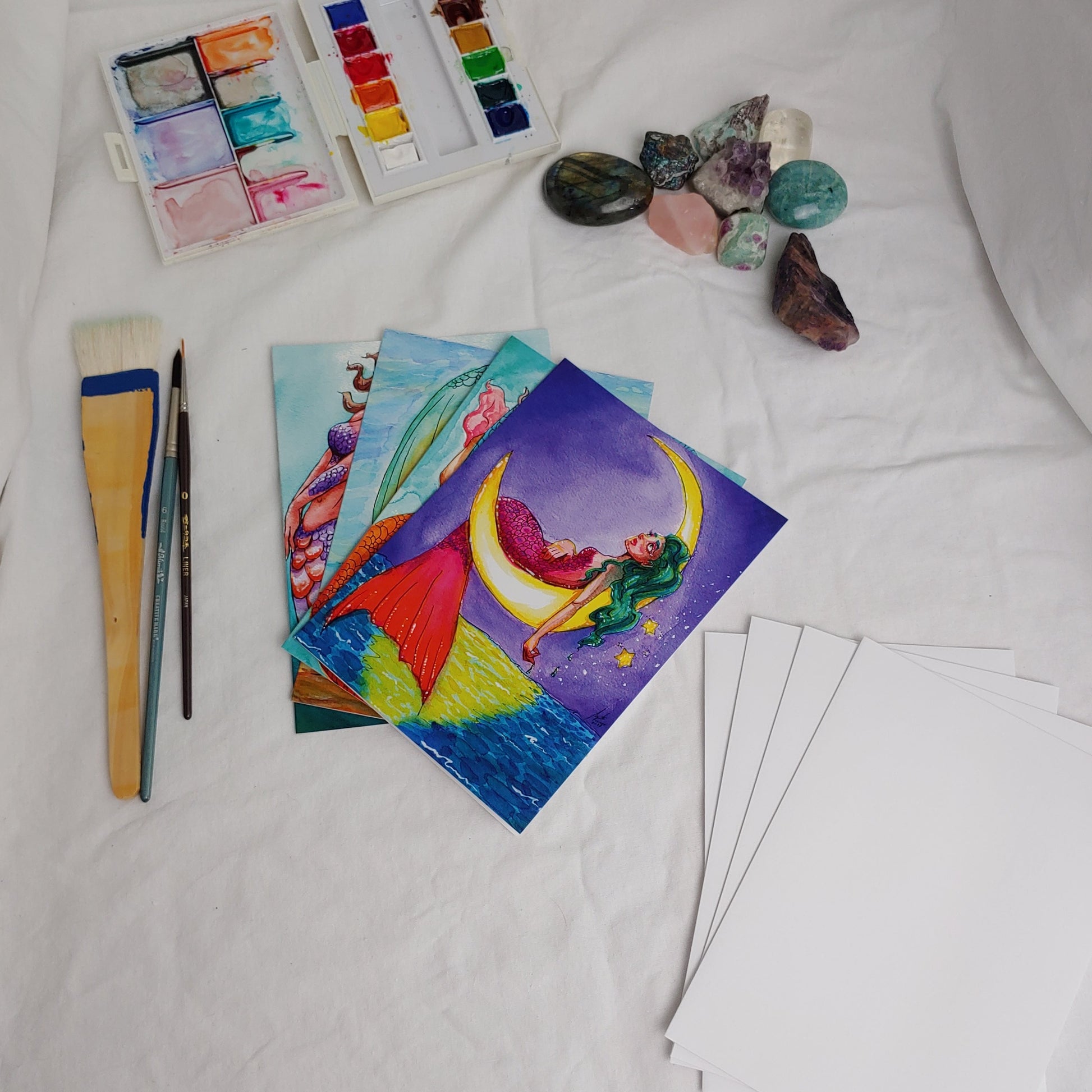8 pack of cards for the discerning letter writer, gift giver, or card collector. Includes one card each of The Mermaid Moon, Purple and Orange Tailed Mermaid, Orange and Teal Tailed Mermaid, Playful Mermaids, Purple Witchy Hat, Flower Elf, Portrait of a Lady-corn, and Teal Haired Elven Priestess.