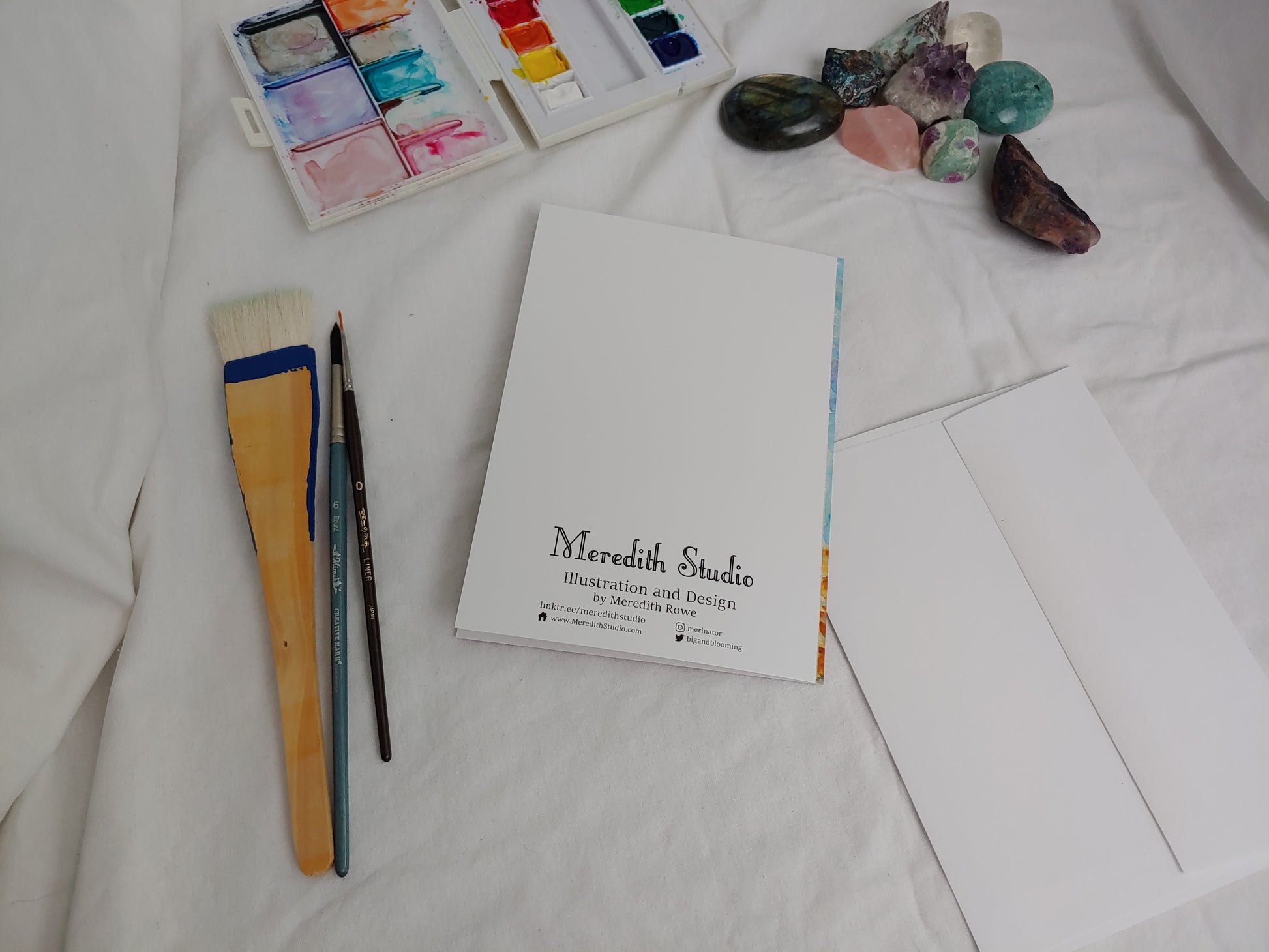 Printed on archival semi-gloss card stock 110 lb. at A7 size 5 wide x 7 high (inches) when folded. Shipped with a clear sleeve to protect it (also archival quality). No gloss on the inside of the card for easier writing. Includes one white A7 envelope per card.