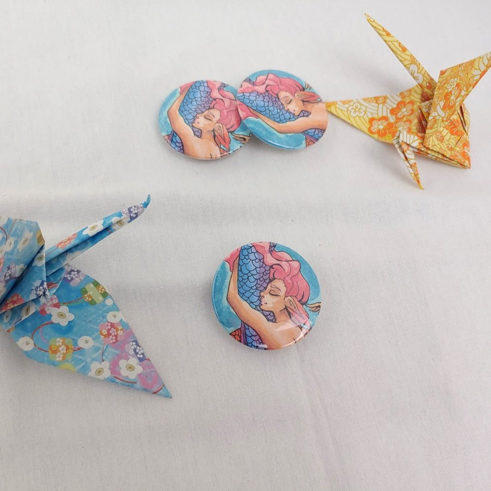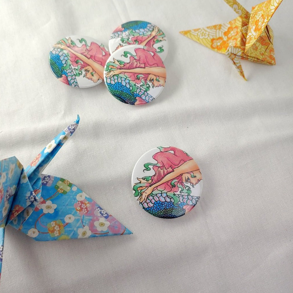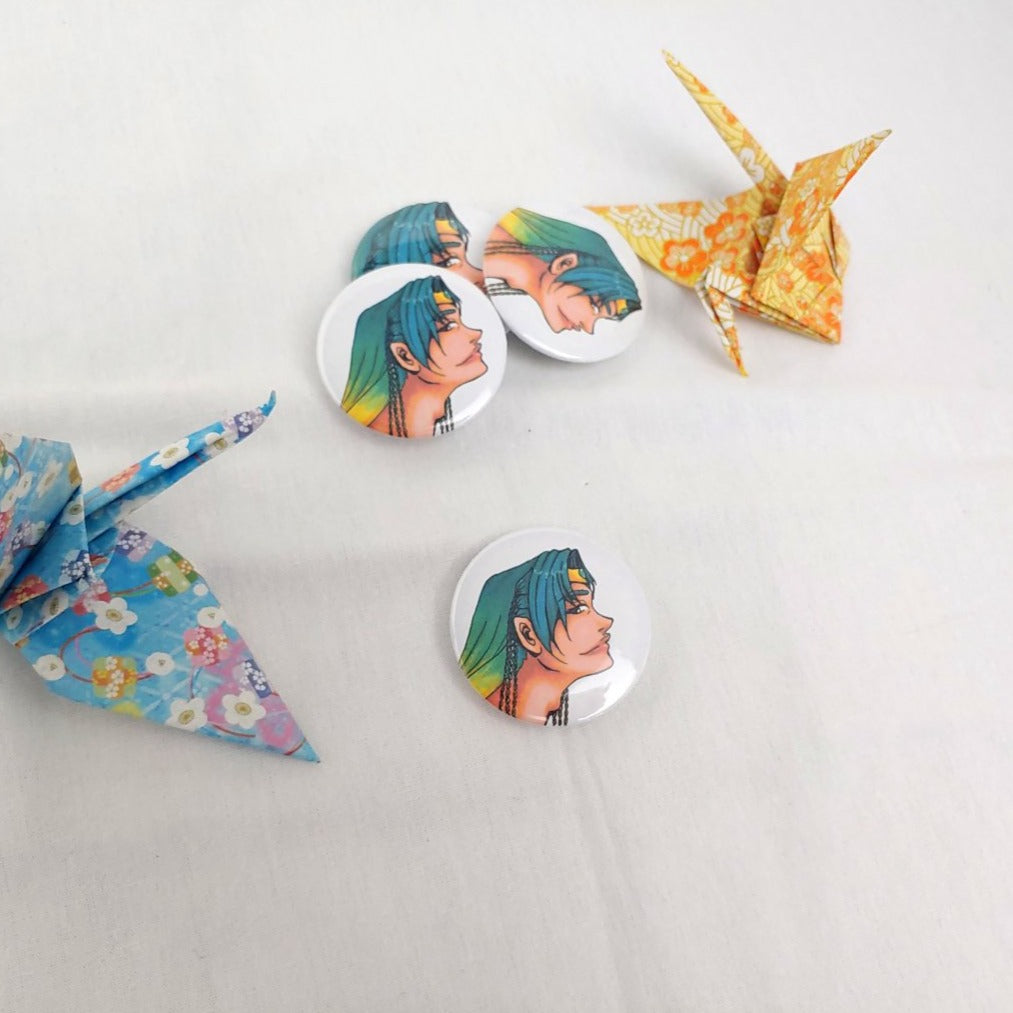 1-3/4 inch (44 mm) button with plastic cover, printed paper, metal and plastic back, with a metal pin.