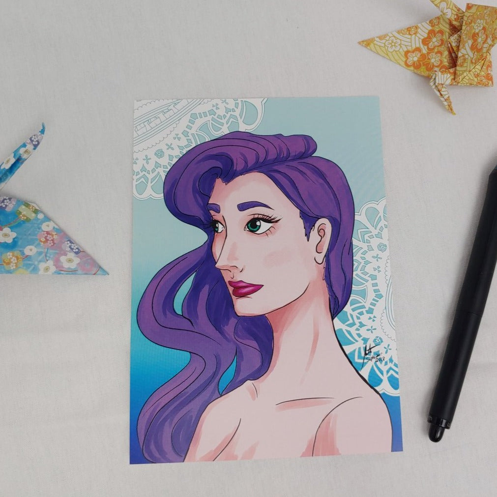 Printed on archival matte card stock 110 lb. at 5 wide x 7 high (inches). Shipped with a pressboard backing and clear sleeve to protect it (both archival quality).